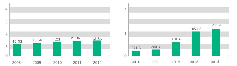 | 截止2012年智能手机用户数达到3.3亿人环比增长13.8% | 012年中国移动互联网产值达到了710.4亿同比增长82%,到2014年将达到1283.3亿 |